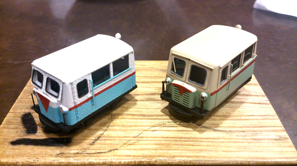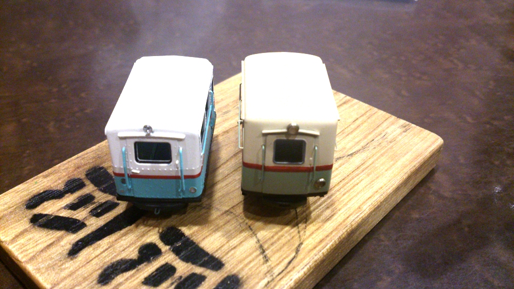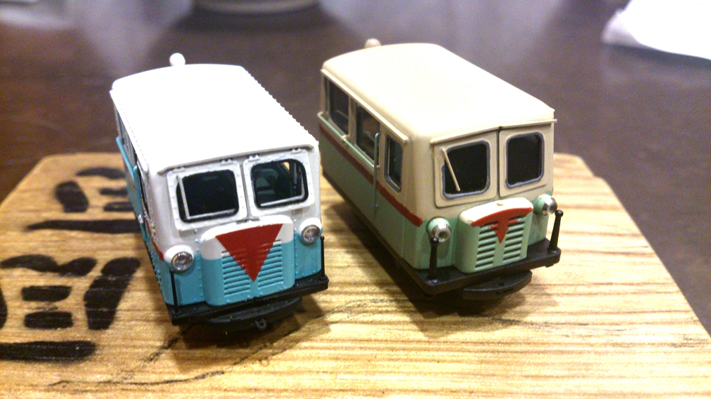 森林鉄道タイプ モーターカー(3) Category:森林鉄道タイプ モーターカー(1/87 9mm) Date:2012年09月08日 金曜の夜、飲み会の席でMW製の木曽MC No.4を見せていただく機会がありましたので並べて撮影してみました。 居酒屋でスマホカメラで撮影ですので画像のアレはご容赦。 モノは牧場通信さん所有の「木曽の酒井製モーターカーⅡ」 ワタシが欲しかったヤツだw。 いやはや、こうしてみるとずいぶんとイメージが違う感じです。 とくにW工芸の方は正面窓が小さく幅広ですし、実車とは意匠が違う感じ。 おしりの比較。 やはり、後部ドア、窓ともにW工芸の方が広め。 なんというか、スケールは別にしてMWの方がイメージをよくとらえて 模型にモディファイしてある気がします。 W工芸の方もリベットがくっきり表現出来ていたり、グリルのスリットの数が正確だったりと悪くありません。 この会合では、思いもよらず別のお宝をゲットしたのですが、それはまたいずれ。 このあとは、いつものように焼酎を飲んだくれて意識朦朧となりましたw PR http://akinoritb.tou3.com/Entry/10/森林鉄道タイプ モーターカー(3)