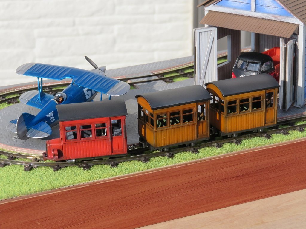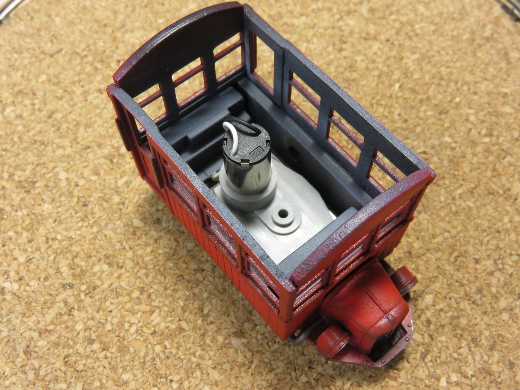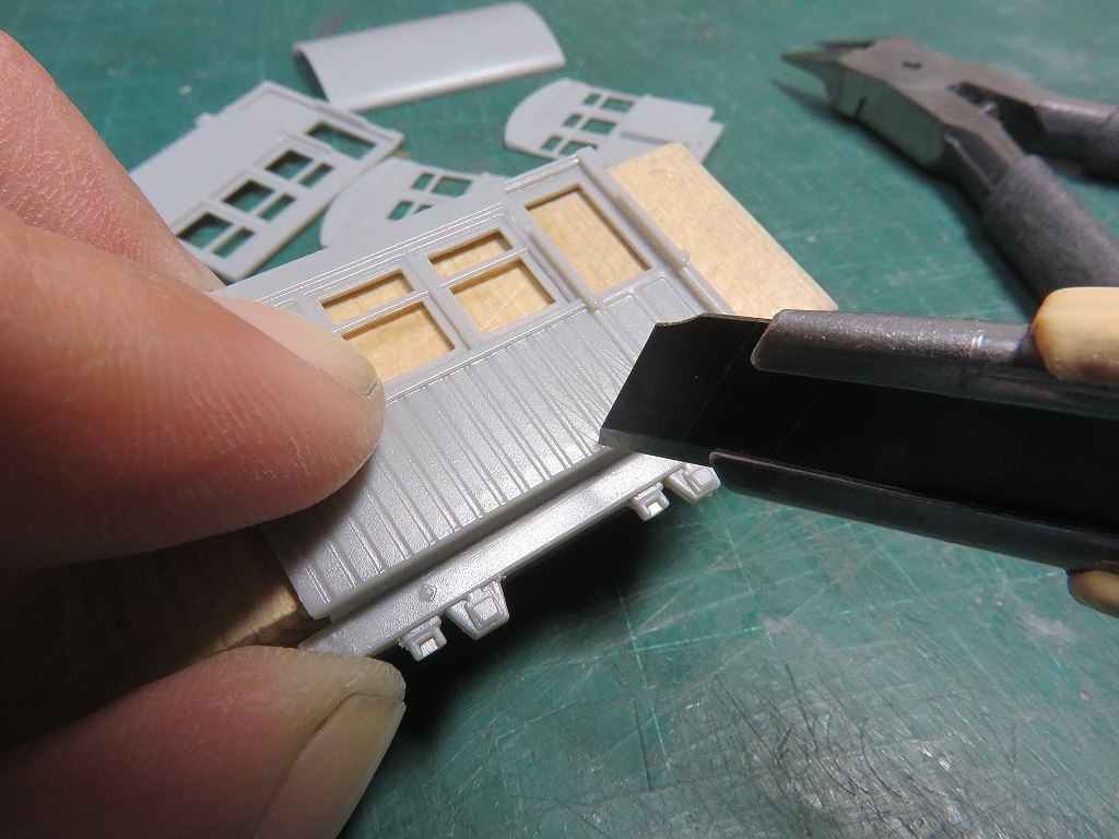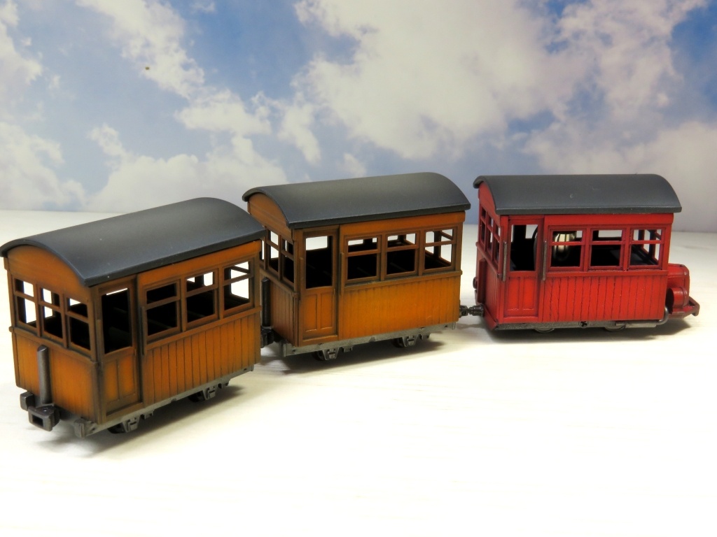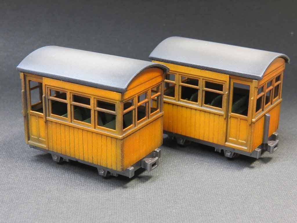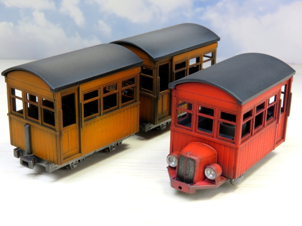 鉄道プラモ 木曽C型客車改造 Category:TMW木曽C型客車(1/87 9mm) Date:2017年01月20日 トーマモデルワークスの鉄道プラモ第2段。木曽C型客車をレールバス編成に仕立て上げました。 部品点数も少ないプラモデルキットです。普通のプラモデル用接着剤で、サクサクと出来ちゃいますので、ちょっとだけ加工。カッターで幕板にテキトーに木目を入れていきます。塗装を厚塗りしなければそれなりに効果あり。 キットの車輪も軸もプラ製ですが、初回限定で金属軸の車輪がおまけについてましたので使います。(実は一つ折ってしまった。) キットには床板パーツがありません。説明書には「厚紙かプラ板で作ってね」とあるのでプラ板で作ります。ついでに椅子らしきものも作っておきました。屋根を接着する前に車体に組み込まないといけませんので組立順序に注意。 塗装は、B/Wでシャドー塗装。その後、クリアブラウンとクリアオレンジで色付け。最後はツヤ消しクリアでコートしています。 キットは2両セットですが、次の1両はレールバスにしてみました。ボンネットとライトはホワイトメタルパーツ。と、ここまではよかったのですが、何も考えずにミッチャクロン・マルチを全体にスプレーしてしまい、プラ車体の表面を溶かしてしまいました…OMG表面がガサガサに毛羽だっているのはこのため。 ヤスリで何とかごまかしながら表面をリカバリーしたのですが、全然ダメ。失意のまま塗装継続~。 客車とのコントラストを考えて赤に。同じくB/Wシャドーからクリアレッドに蛍光レッドを足して色付け。 レールバスは動力取り付けの関係で1mm程、全高が低くなってしまいました。 動力ユニットはワールド工芸のイベント限定ジャンク品を仕込みました。車内窓下位置には出来るだけウェイトを積み込んでいます。 裏側はこんな感じ。動力ユニットと車体の取り付けは左右の集電板にじかにネジ止めです。 前作 Ironika Park Railway に乗り入れ。 レールバスはなかなかに愛嬌のある顔になりました。お気楽、鉄道プラモデル。いろいろと改造ネタになりそうですので追加購入するか!?ではまた。 PR http://akinoritb.tou3.com/Entry/123/鉄道プラモ 木曽C型客車改造