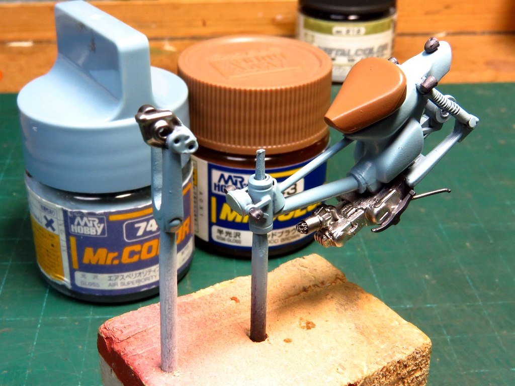 カラーリングはエアスペリオリティブルーにシートはレッドブラウン。今回元の塗装は剥がさず直接吹いています。(いや、ホントは元塗装を剥がそうと、イソプロピルアルコール(IPA)漬けにしたんだけど剥がれなかったのですよ。)