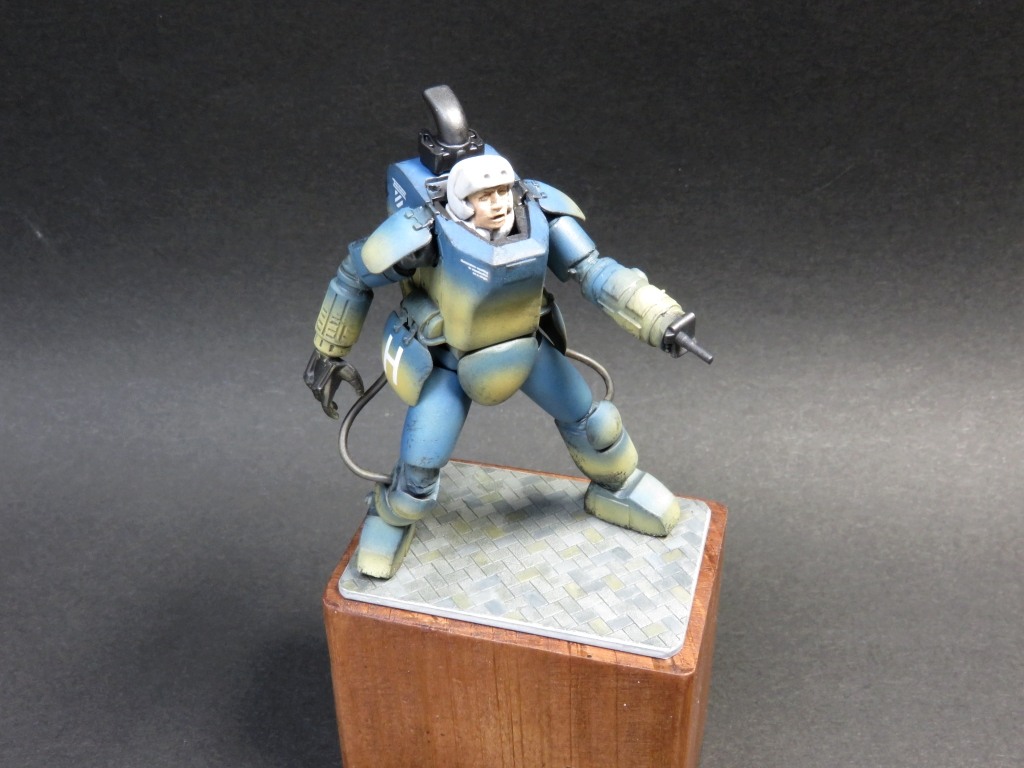 ガチャキットの脚はほぼ固定なので、ちょっと真鍮線とパテで踏ん張りポーズに変更してみました。これだけでもグンとカッコ良くなります。パイロットはキット付属のものはモールドがダルイので、またタミヤ兵の顔を使います。
