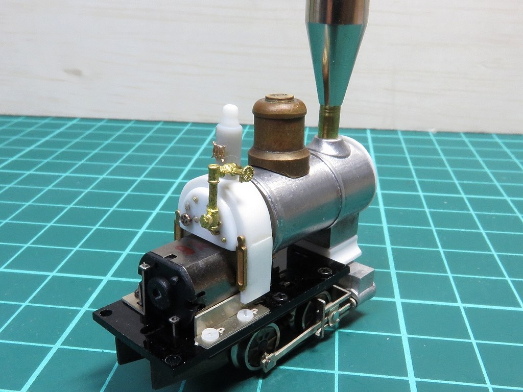 今回の使う動力ではキャブ内にモーターがある配置ですが、キャブが大きいので見えても気になるほどではありません。でもちょっとだけ目隠しもかねてバックプレートの一部を載せることにしました。至ってテキトーですけどね。