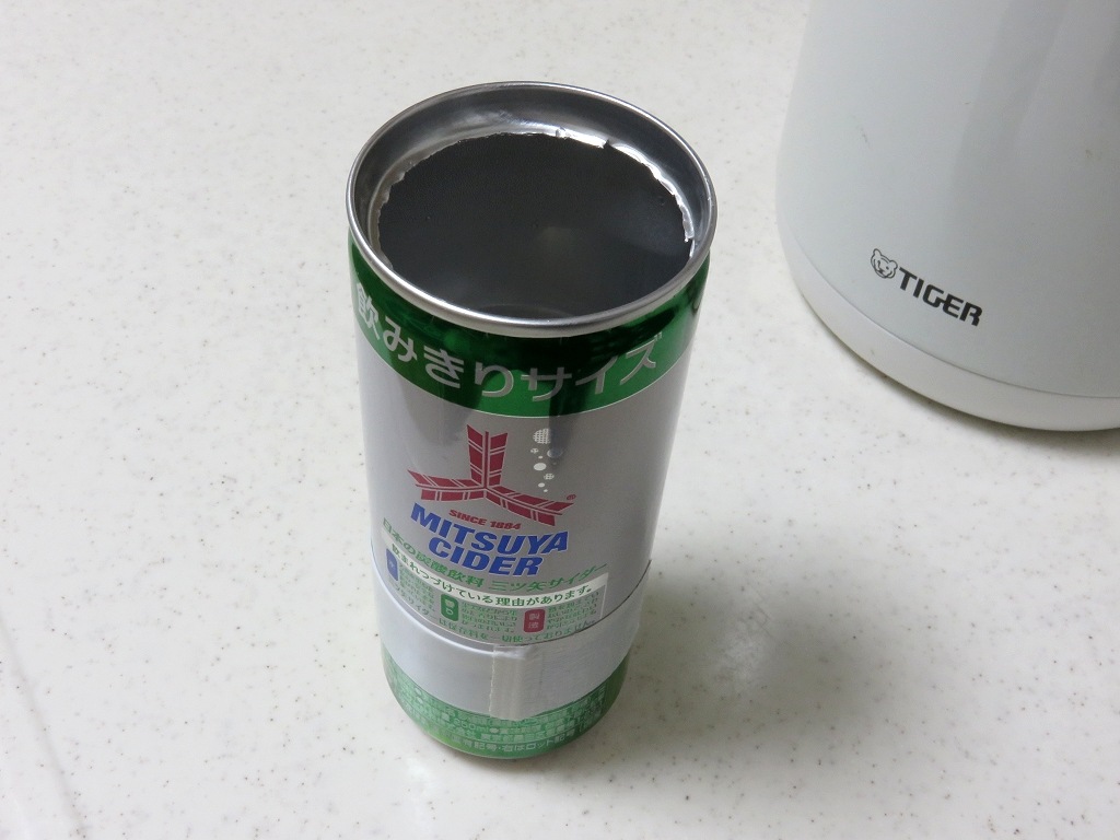 1.缶切で開けた空き缶に、プラ板を強力タイプのガムテで巻きつけ。