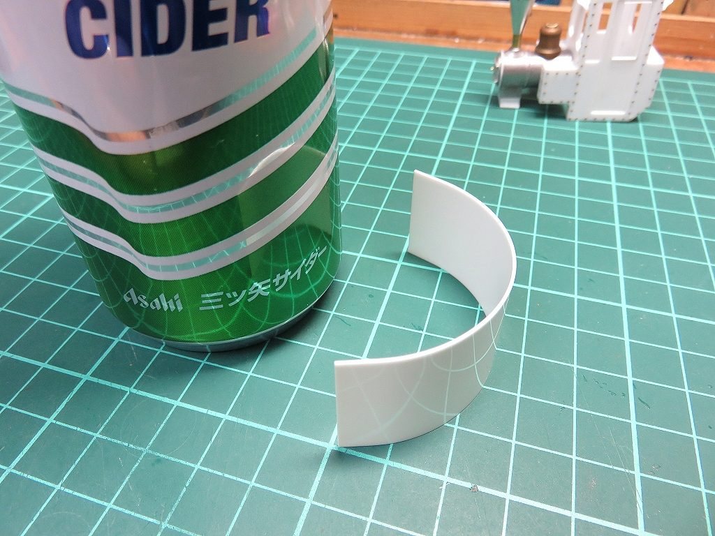 続いて、屋根の工作。スジを平行に入れてアールを付け、瞬間接着剤で折れないように補強という方法もありますが、これでは基本的に平面の連続ということになります。プラ板工作では曲げ加工は鬼門。基本的に熱を加えないと曲がってくれません。そこで空き缶&熱湯の登場です。