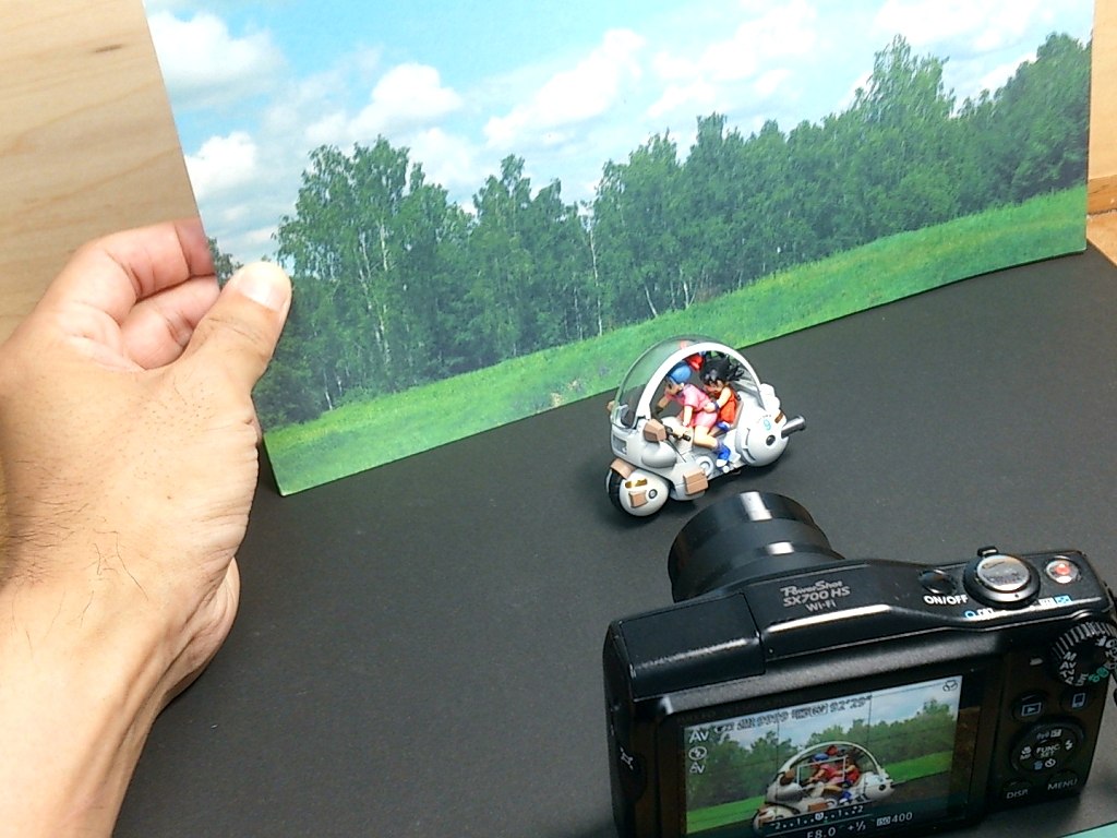 コンデジのシャッタースピードは1/15秒ぐらい。タイマー撮影にしてシャッターが切れる瞬間、紙に印刷した背景をスッと動かせば、流し撮りのような画像が撮れる(しかも被写体はブレない!)という小技でした~。