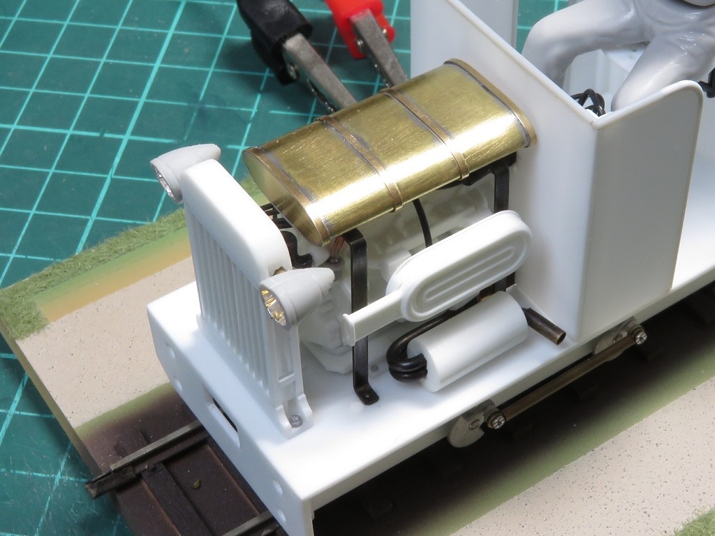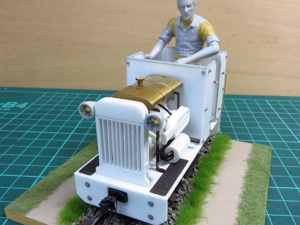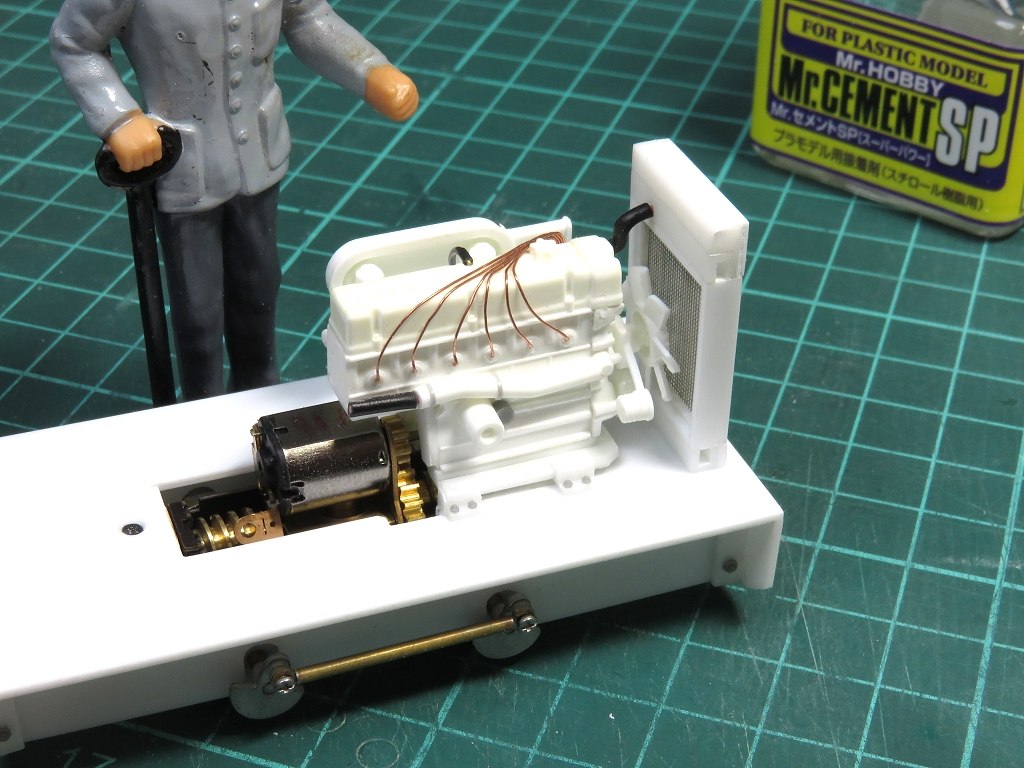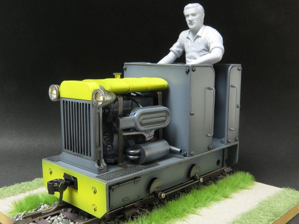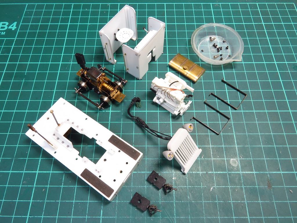 Gn15ガスロコ Category:Gn15ガスロコ(1/24 16.5mm) Date:2017年10月09日 今回はとうとうGスケールに手を出してしまいました。縮尺はプラモ流用を考えて、1/24スケールで行くことにしましたヨ。 今年の軽便祭では、「蒸機以外のロッド駆動式の機関車」というのがクリッターズ・クラブのテーマ。しかしウチには該当する機関車はありません。とりあえずスクラッチすることにしたのですが、せっかくならば新しいことをしましょ!ということでGn15※のガスロコを作ってみることにしました。※ちなみにGn15ってなんじゃい!という方は、こちら(https://en.wikipedia.org/wiki/Gn15)とか、こちら(http://forum.gn15.info/)をご覧あれ。 Gn15ということで1/24のエンジンが入ったのフジミのプラモデルを買ってきました。どうやら日産フェアレディ240ZとハコスカGT-Rのエンジンのようです。と言うか、該当プラモのエンジン関連のランナー部分だけ切りとってキットにしているようです。そういう売り方もあるのか。まぁ私にはちょうど良いワケですが。 で、240ZのL24エンジンを切った貼ったで搭載しました。まぁいいんじゃない?ラジエータ部分はプラ板から。 エンジン上部は燃料タンクを配置。真鍮パイプを万力で挟んで扁平にし、帯板をハンダ付けしてガソリンタンクとしました。特徴的なエアクリーナーはデカいなぁ。左右の砲弾型ヘッドライトはその名の通り、飛行機プラモから拝借した対地爆弾の弾頭部分から。電球色のチップLEDを埋め込みました。 運転席は、計器盤・レバー類・トランスミッションカバー・椅子などごちゃごちゃ配置してみました。 計器盤の中にLEDとパワーユニットをつなぐコード・コネクタ類が隠れるようにします。こういうところは現物合わせですなぁ。と言うか、全部現物合わせだけど。 パワーユニットはアルモデルの「アルパワーHO-24.5A」平ギア2段減速で程よい走行性能の製品です。電気配線は分離を考えてコネクタを設置。 部品構成はこんな感じ。ほとんど1mmプラ板での工作ですが、ネジで分解できるように接合部分にはM1.4でタップを立てた真鍮の小片を埋め込んでいます。塗装前の状態。 六角リベットはWAVEのモノを貼りつけています。手作り感あふれるホームビルドな機関車ですな。 塗装は、グレーベースにイエローを追加。とあるフォードソンのトラクターの塗り分けを参考にしています。決して、作業中にBGVとして流していたマクロスFのVF-25Sオズマ・リー機を参考にしたワケではありません。 計器盤にはヒコーキプラモからのメーターのシールを拝借。 裏側はこんな感じ。パワーユニットの固定は車体側の7mm真鍮角パイプにステーを介して固定。こういうステーまでパワーユニットのおまけパーツとして入っているあたり、アルモデルさんの自作派モデラーに対する心遣いがウレシイ。 運転手はフジミの1/24のメカニックフィギュアから。塗装していないのは時間が無かったからで、決して、フィギュアの塗装が苦手なのであきらめたワケではない、ハズ。~メイキング&走行テスト~これまで1/87、1/64、1/48とだんだん作る機関車の縮尺が大きくなってきたけど、やっぱ1/24はデカいですよ。ではまた。 PR http://akinoritb.tou3.com/Entry/138/Gn15ガスロコ