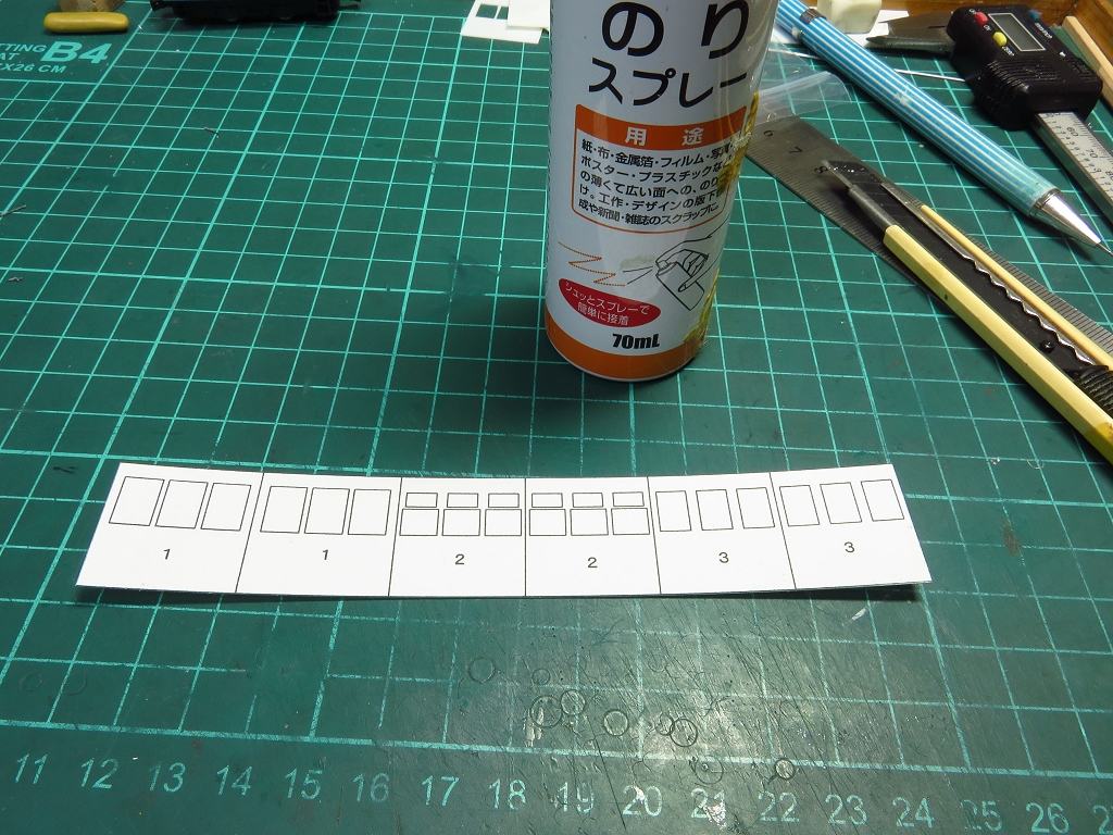 プリンタで印刷した図を0.3mmのプラ板にスプレーのりで貼りつけたら、カッターで切り出します。