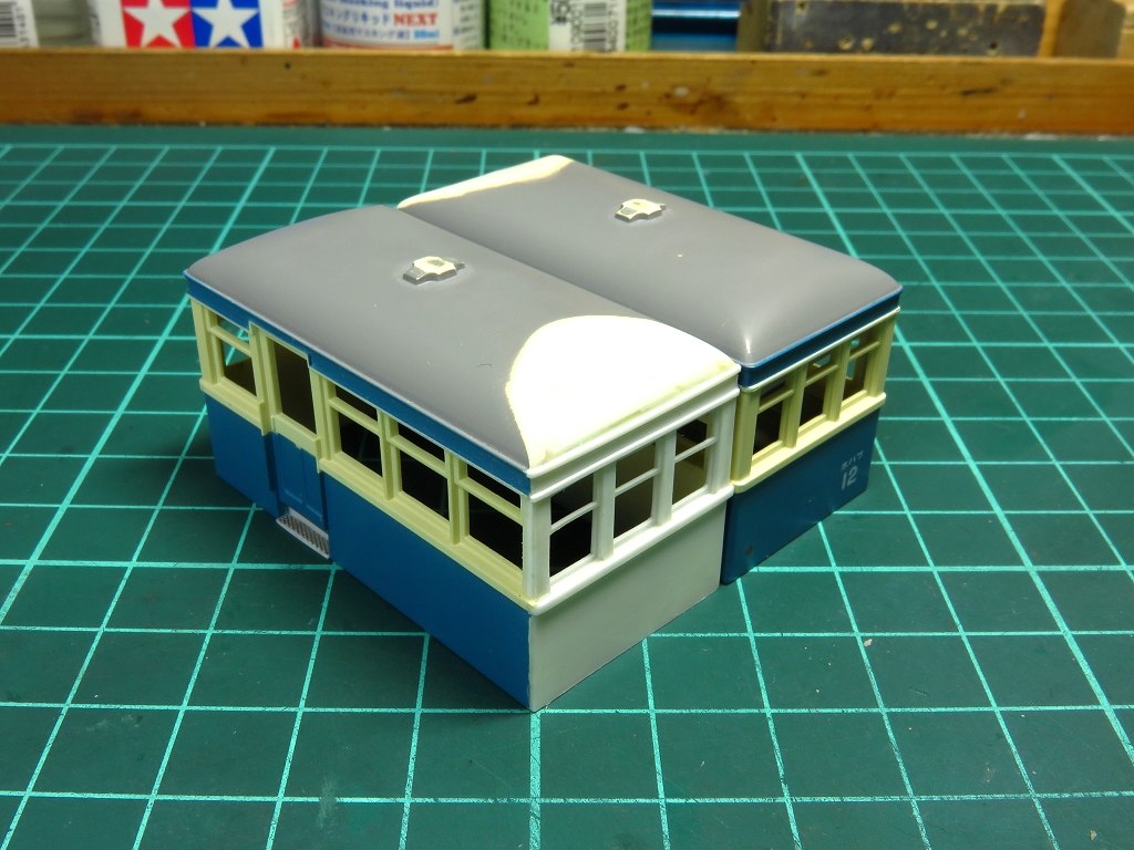2分割した妻面はこれで完成。屋根は裏側にパテを詰めてオデコを削り出しますが、ちょっと削りすぎかな。2両目も同様に加工。