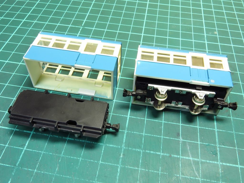 床板も2分割して使います。2軸の足回りにはアルモデルの貨車用台車のホワイトメタルパーツを使いました。車輪はジャンク箱から適当にNゲージのピボット付き車輪をあてがいました。朝顔型ダミー連結器も穴をあけて、床板側にタップを立ててねじ止め。あまり絞めこまずカプラーが首を振るようにしておくと急カーブでも行けるようです。