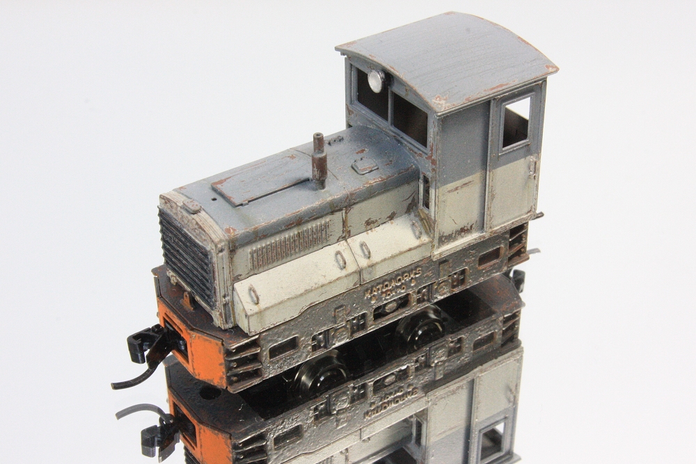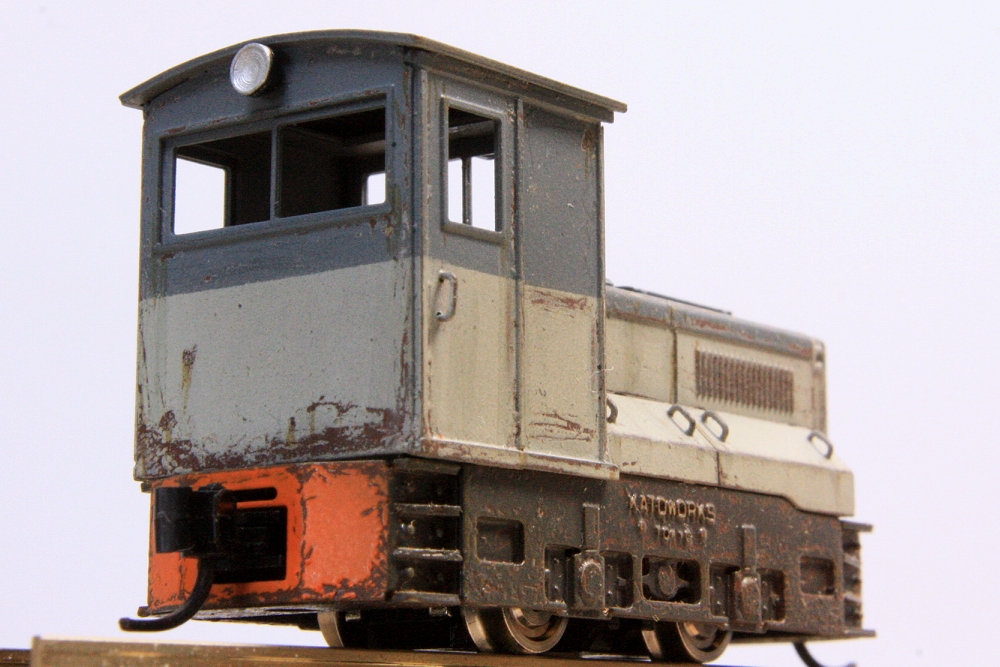 アルカトウ(3) Category:アルモデル加藤7トンDL (1/87 9mm) Date:2012年10月27日 アルカトウ塗装です。ギタギタだ… プライマー乾燥の後、ベース塗装は剥がすことを前提として、金属地としてクロム、次に錆色にレッドブラウンを吹きました。ただ、あとから剥がしてみたらクロムは余計でした。クロムの層まで剥がすとピッカピカになってしまって、逆効果。今回もここでヘアスプレーでいったんコートして剥離層を作っておきます。ボディは、ニュートラルグレー+少し黄味のグレーを調色して、やっぱり俺色ツートンに。台枠はジャーマングレー+オレンジ。剥がす前はキレイだなぁ(笑このまま後はあっさりウェザリングで済まそうかとも思いましたが…いや、剥がしたい。剥がしたいw水で塗装をふやかして爪楊枝でツンツンツンツンツンツン。乾いたらコピックで雨だれウェザリングを追加で書き込み。タミヤの粉で埃っぽくしたうえから、軽く艶消しクリアでコート。子供にみせたら、スゴイ!本物みたいとほめてくれましたが、こんなホンモノはない(笑奥様に見せたら、無言。おそらく「なぜ、わざわざ汚いモケイを作ってるんだ」と思われていることでしょうなぁ。 PR http://akinoritb.tou3.com/Entry/17/アルカトウ(3)