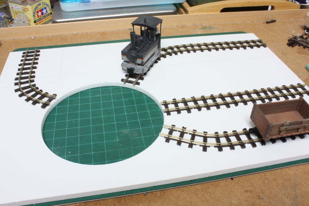 仮・倉庫レイアウト(1) Category:A.K. Brewery (1/64 9mm) Date:2012年07月22日 しばらくレイアウトには手を出していませんでしたが、 妄想も固まってきたので着手してみようかと思います。 タイトルは決まるまで仮題としておきます。 というわけで、イントロ画像は妄想をCGにしてみたもの。 ノートの手書き落書きをベースに Sweet Home 3Dで遊びました。 模型作りだけでなく、ワタシにとってはこの作業も重要な遊びのうちです。 サイズは300mm×200mmぐらいでターンテーブルをメイン。 入れ替え遊びができる倉庫風のマイクロレイアウトなんてのはどうかなと。 どこかの一企業(ビール会社かなんかでどうかナ?)の倉庫から、 せっせと段ボールを運んで出入りする小さい機関車と、 機関庫に佇む整備中の2号機とか…。 会社名を決めないとね。(ビール会社ってBrewing Companyでいいのかしらん。) 妄想はさておき、工作開始。 ベースは完成時の重量を出来るだけ軽くしようという目論見から、5mmの発泡塩ビ板をセレクト。 早速、メインとなるターンテーブル部分からサークルカッターで切りだし。 さすがに発泡塩ビ板です。加工性は抜群。 気持ちいいぐらいにサクサク切れますが、サークルカッターに慣れていなかったので真円になりませんでした。 続いて9mmフレキを適当にグイと曲げて仮置きしてみました。 せまい…。 これは、コンセプト通り、ゆったり運転を楽しむというわけにはいかないようですね。 さて、このあと、どうなりますか。:-) PR http://akinoritb.tou3.com/Entry/6/仮・倉庫レイアウト(1)