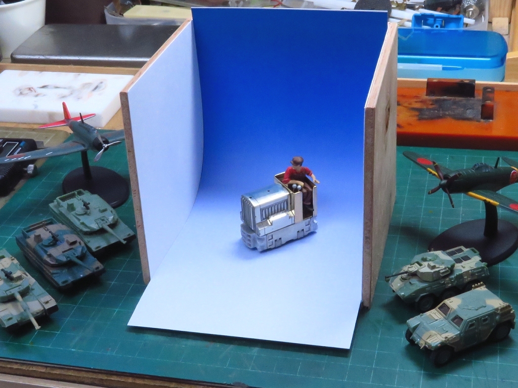 机の上で大日本帝国陸・海軍機と陸上自衛隊10式戦車でドンパチごっこやって遊んでるときや、工作途中で撮影のため工具を片付けなくても、散らかった背景をフレームに入れずに撮影できるというわけです。
