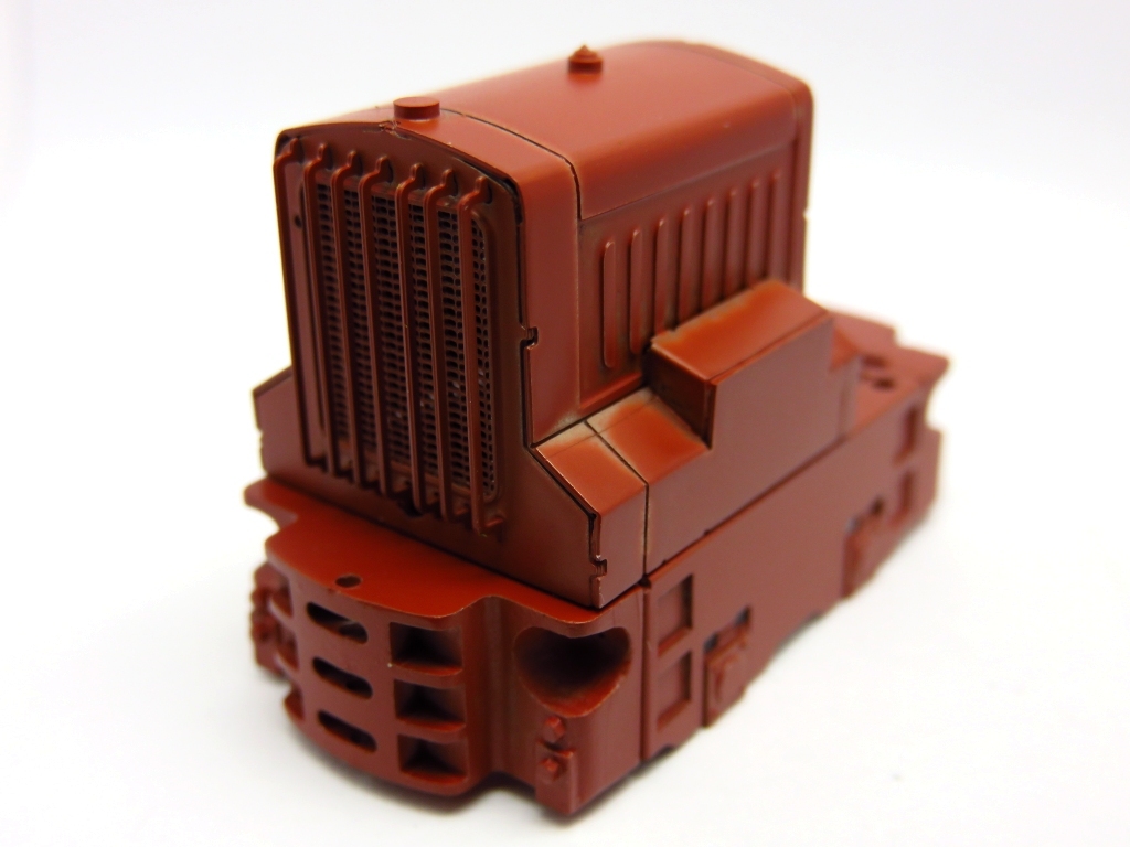 早速、下回りをホワイトメタルと板の分割位置でそれぞれオレンジと焼鉄色に塗り分け。