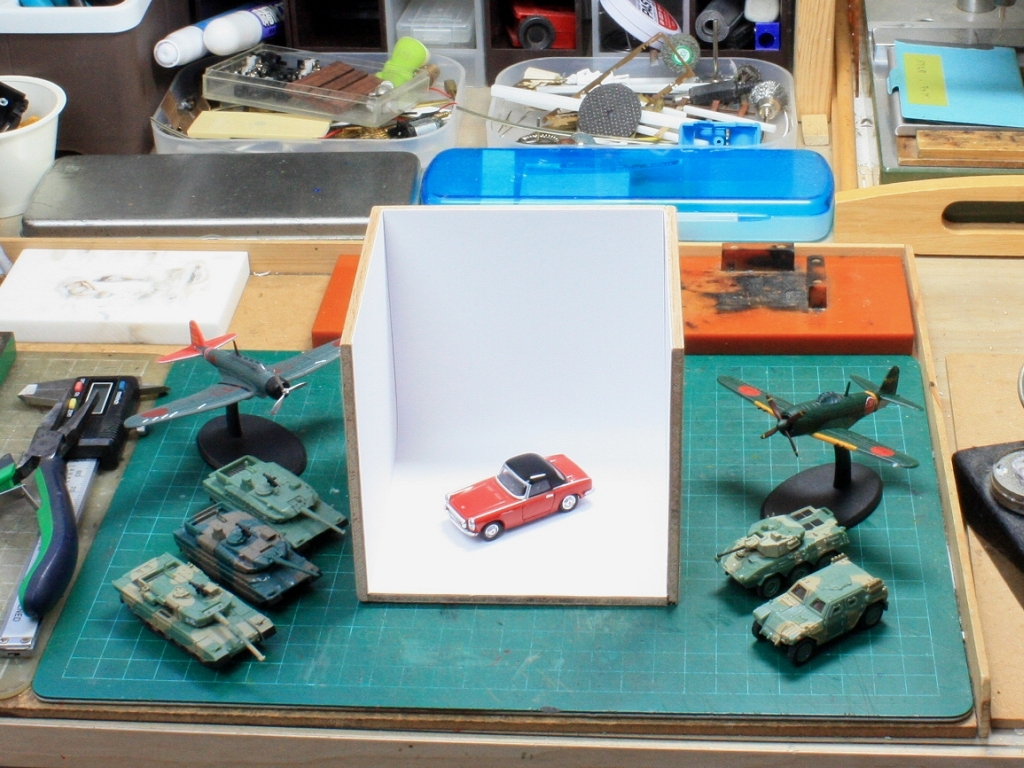机の上で大日本帝国陸・海軍機と陸上自衛隊10式戦車でドンパチごっこやって遊んでるときや、工作途中で撮影のため工具を片付けなくても、散らかった背景をフレームに入れずに撮影できるというわけです。